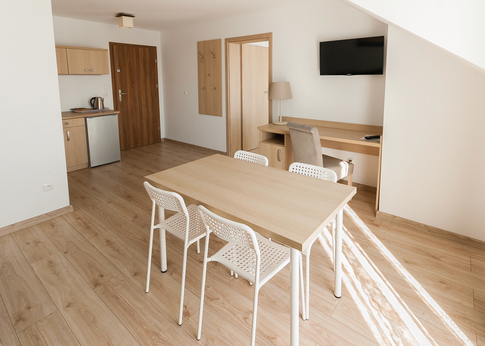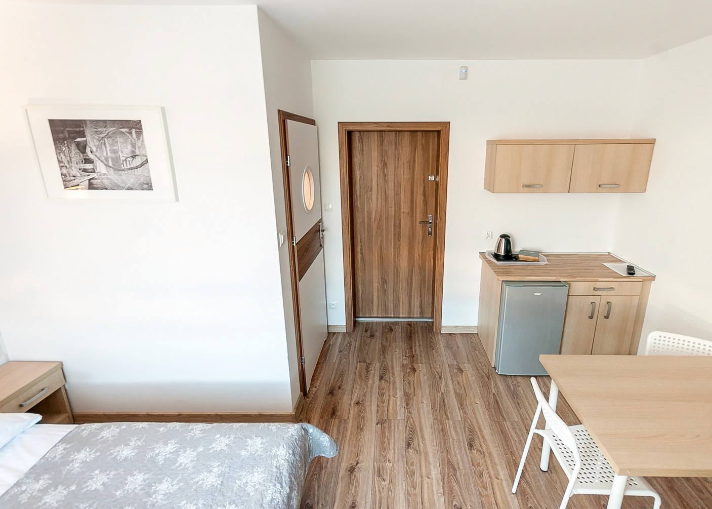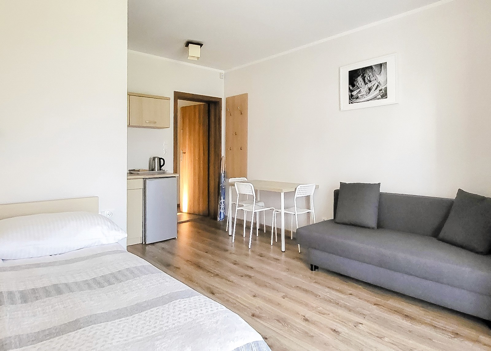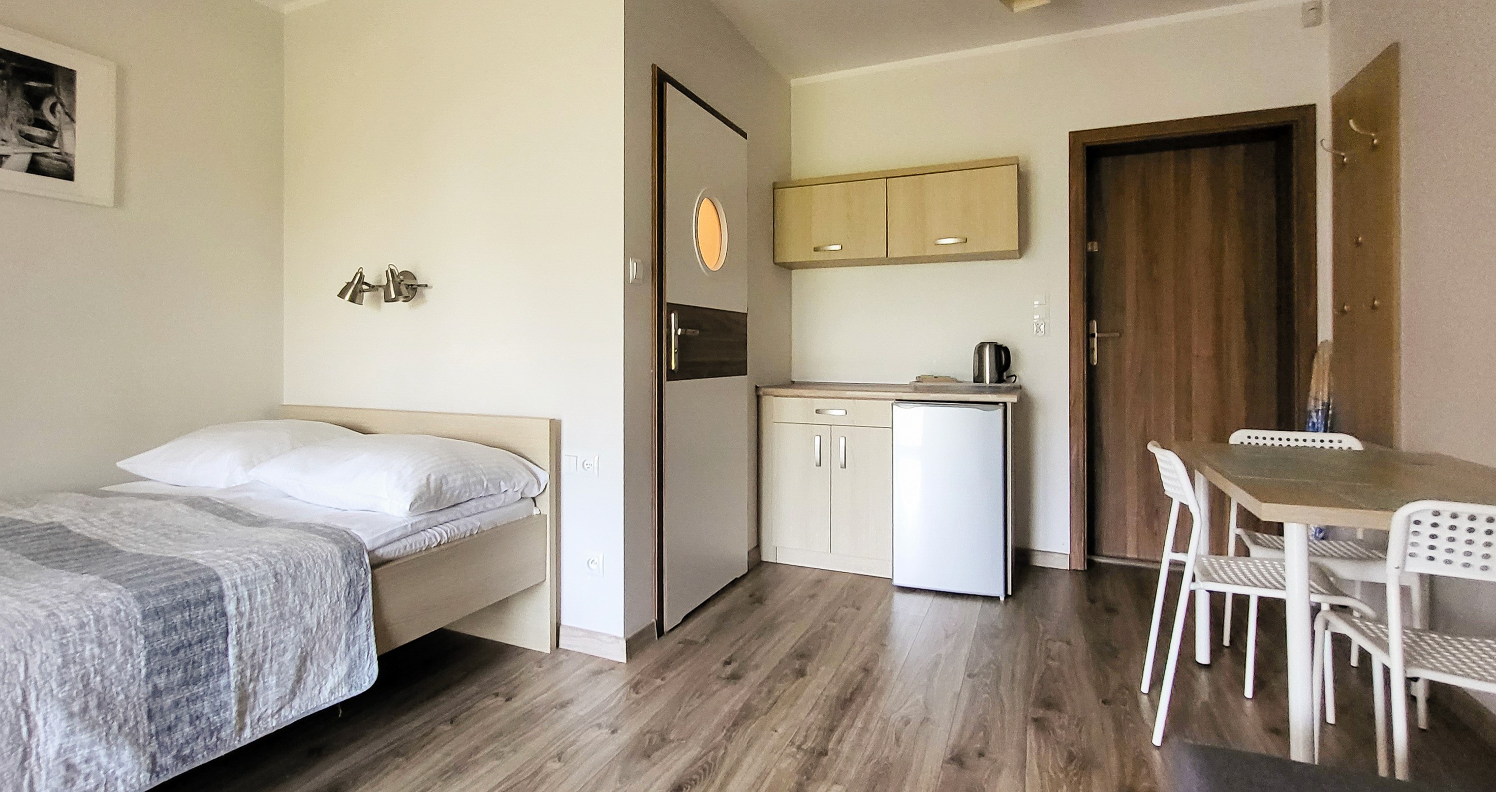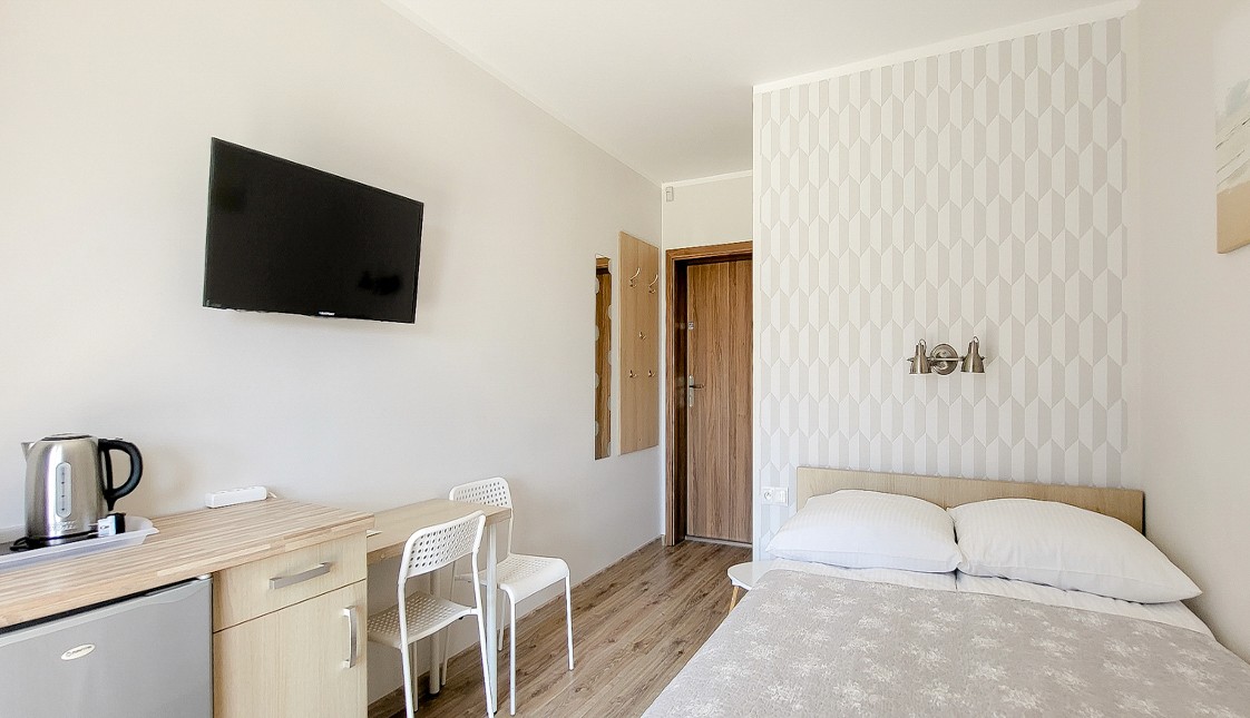 Przytulna przestrzeń do relaksu w komfortowych warunkach. Pokój wyposażony w blat kuchenny, lodówkę oraz komplet naczyń.