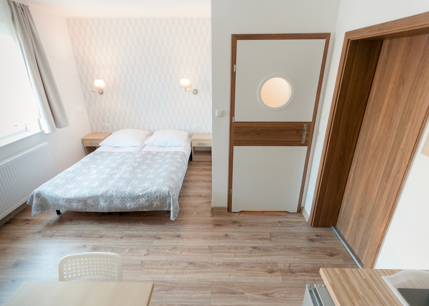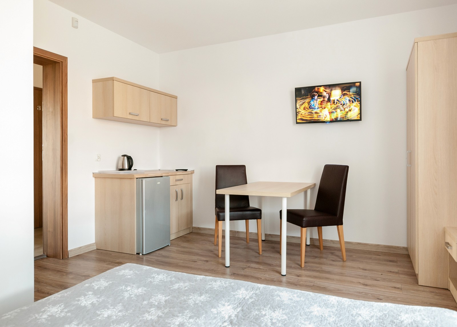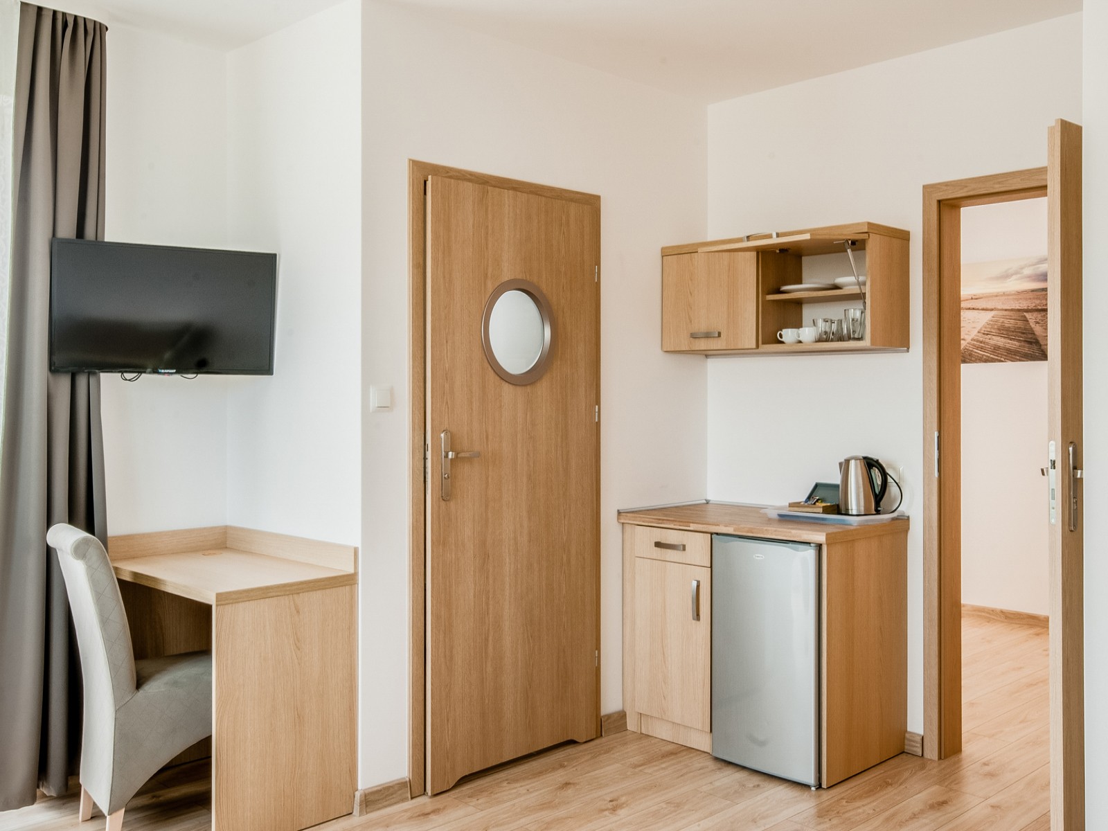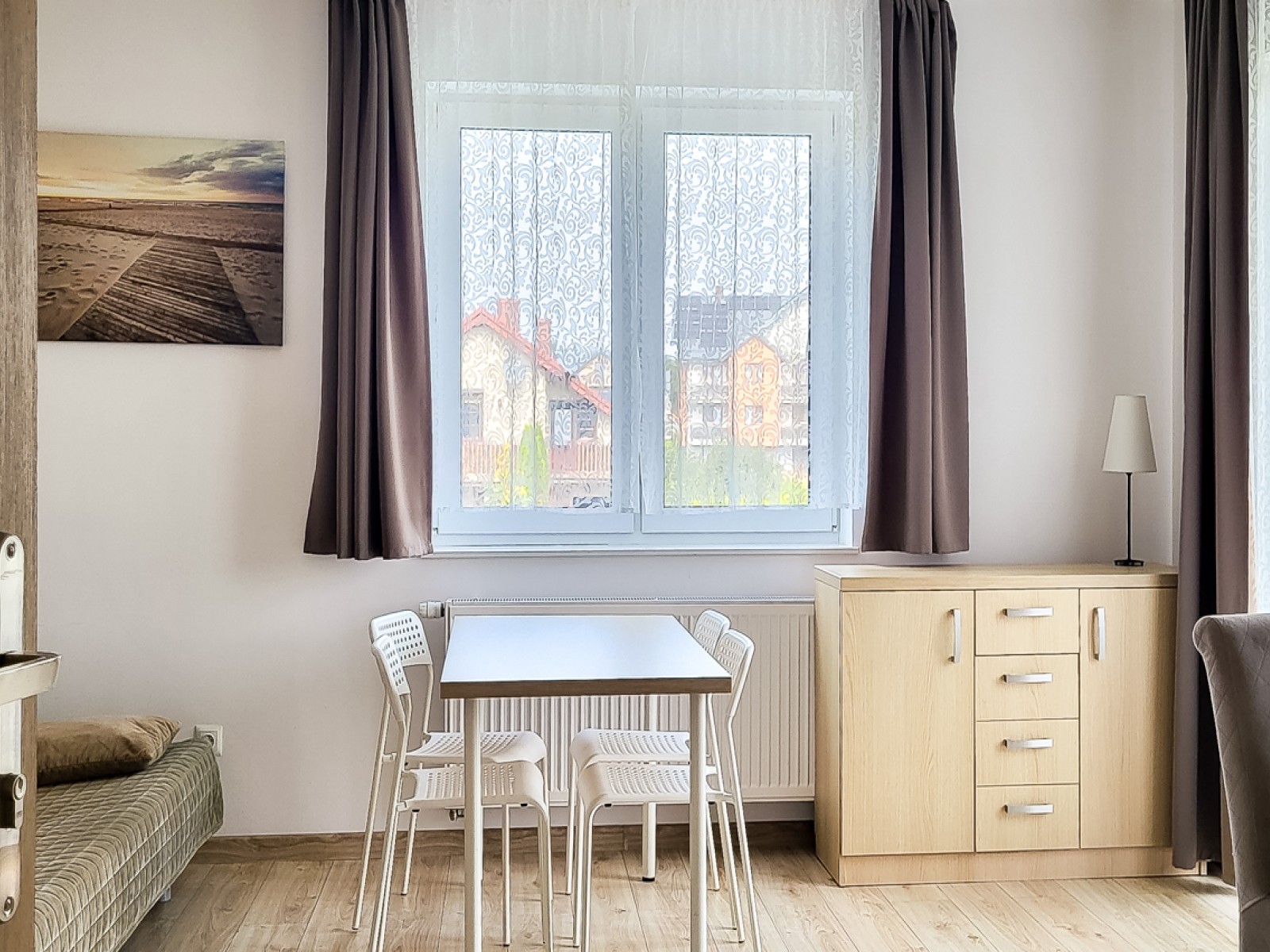 Przytulna przestrzeń do relaksu w komfortowych warunkach. Pokój wyposażony w blat kuchenny, lodówkę oraz komplet naczyń.
