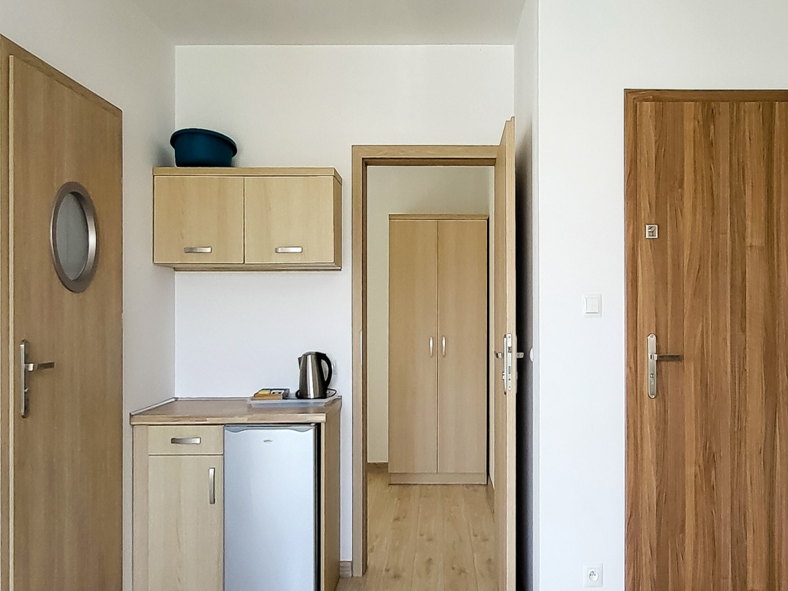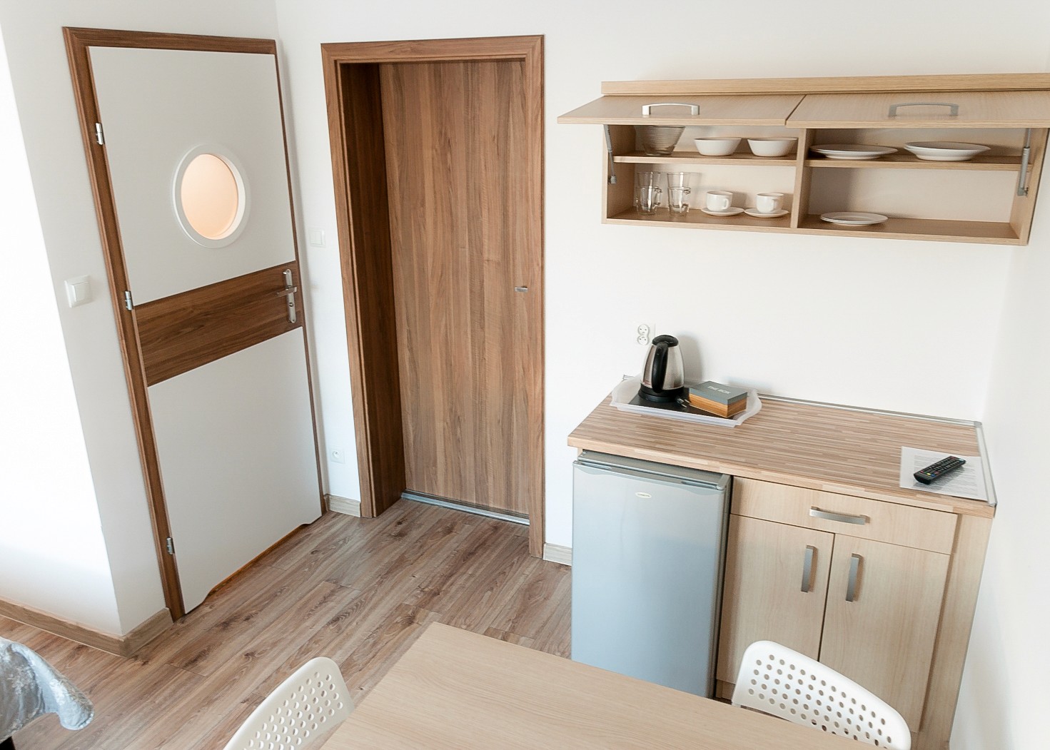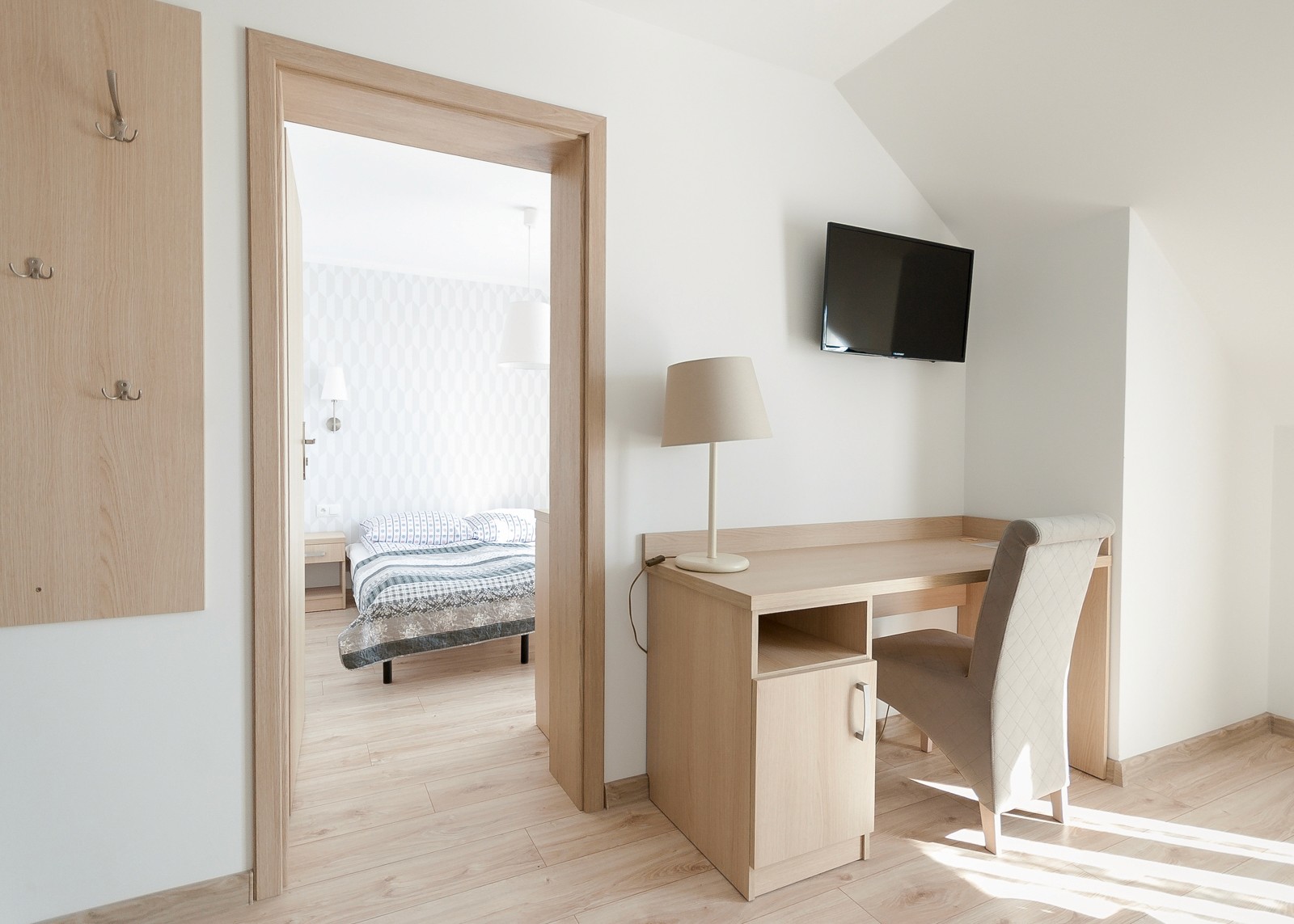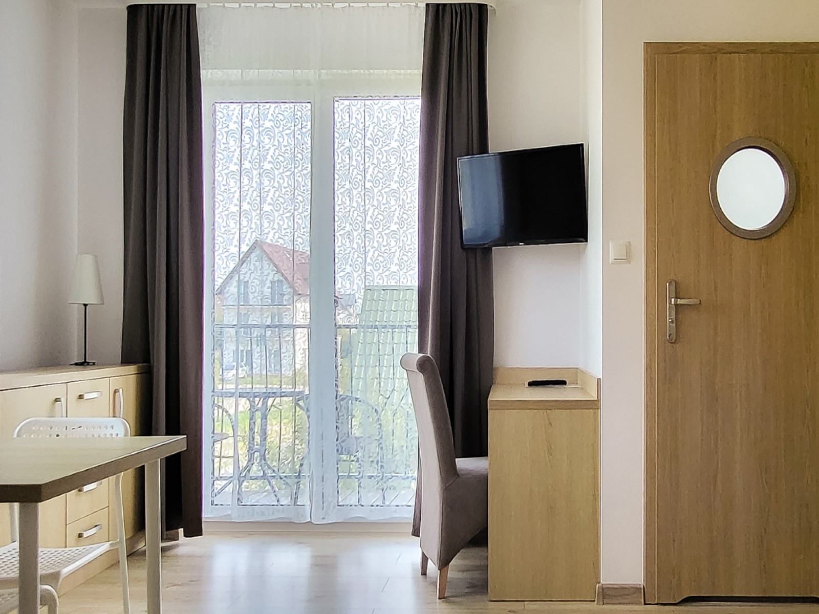 Przytulna przestrzeń do relaksu w komfortowych warunkach. Pokój wyposażony w blat kuchenny, lodówkę oraz komplet naczyń.