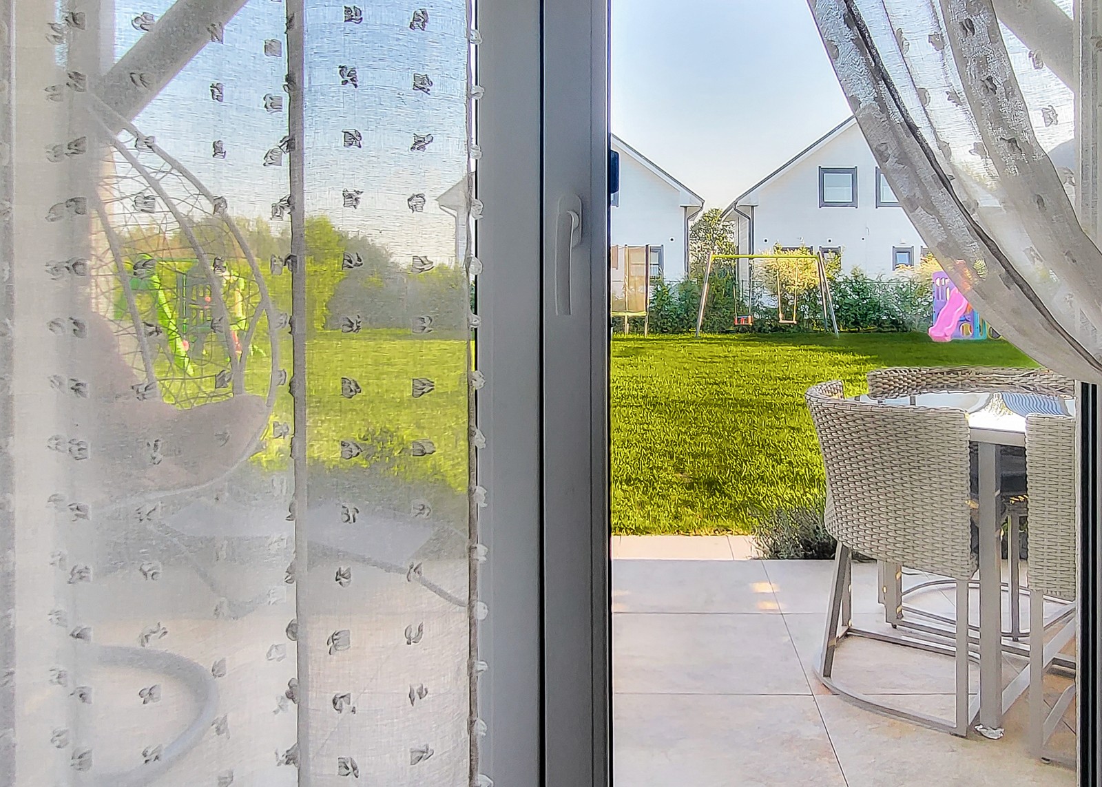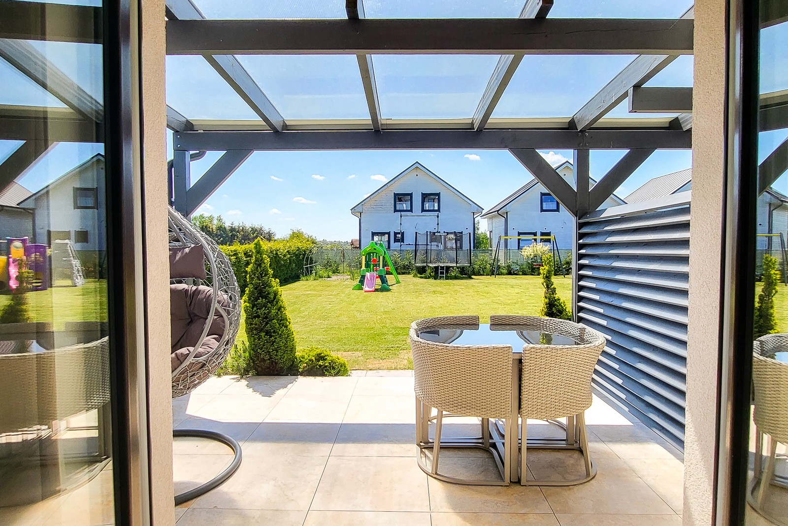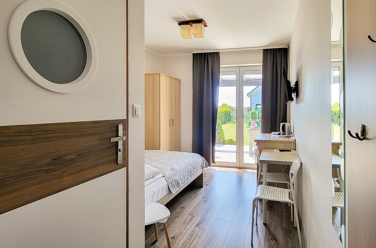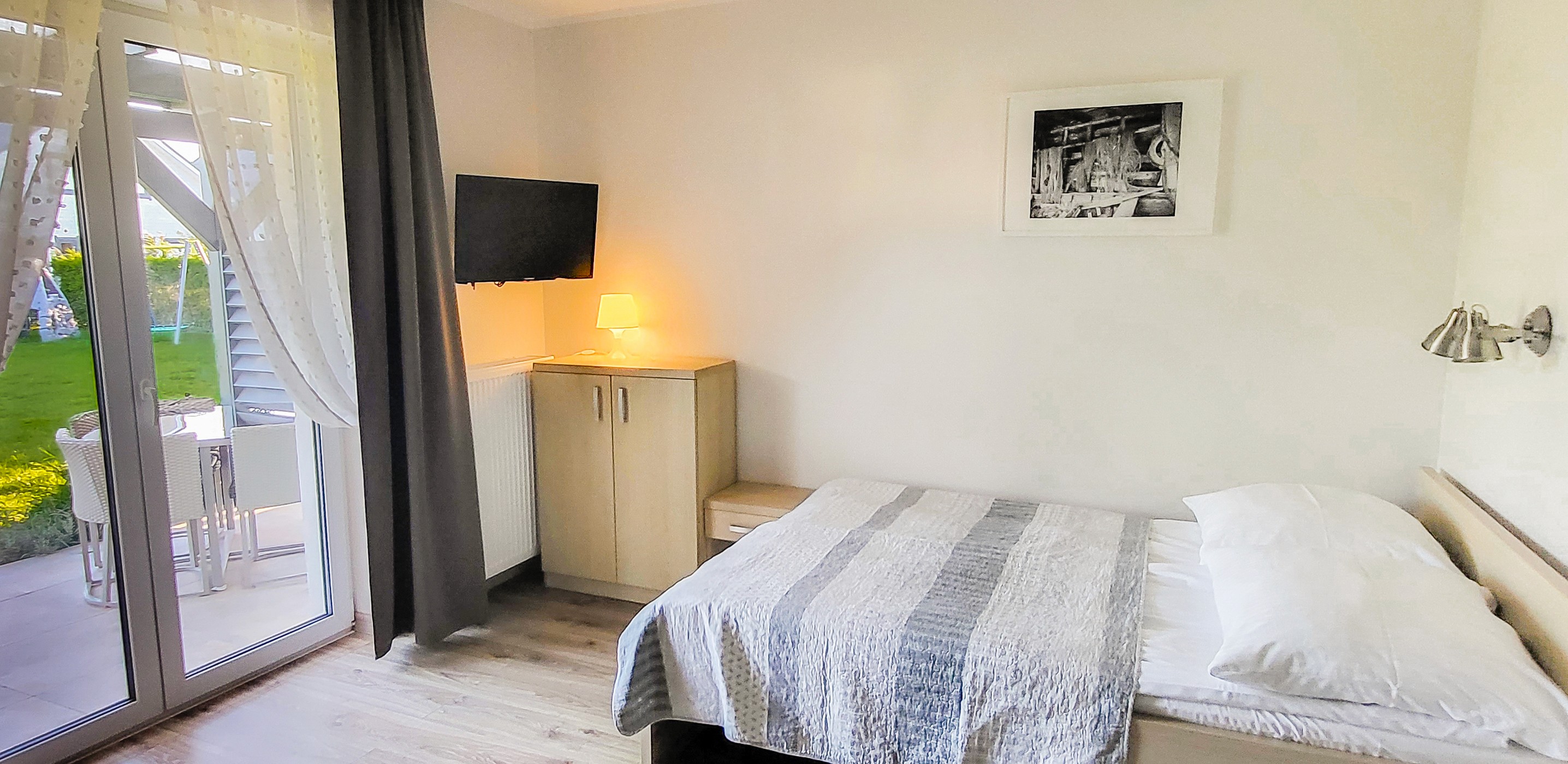 Pokój posiada zadaszony taras ze stołem ogrodowym, krzesłami oraz bujawką.