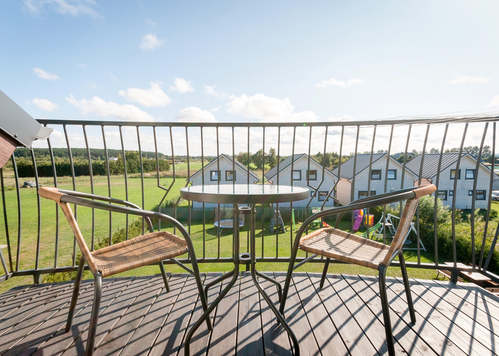 Apartament posiada dwa balkony. Na balkonie zewnętrzne krzesła i stolik.